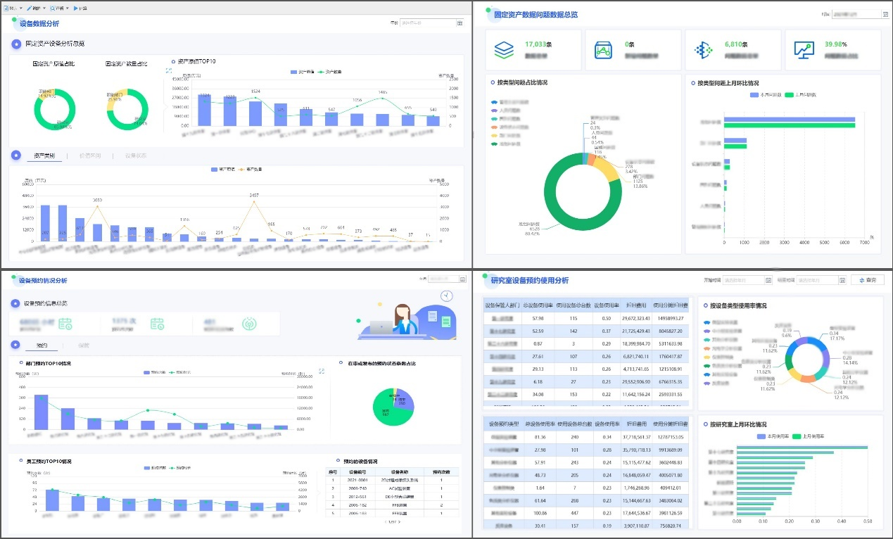 其次,围绕设备主数据相关内容,整合物资管理系统、设备共享应用等系统,完成约20张专题看板建设,初步完成了设备使用管理及预约共享业务的可视化,为企业管理者给予了全新的业务视角。