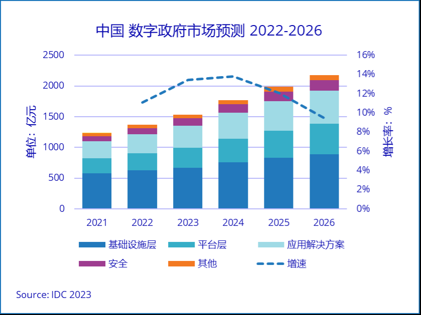 据IDC中国数字政府市场报告,2022年整体市场规模达1372亿元,市场规模巨大。IDC 预测,在 “十四五” 规划和数字政府政策的引导下,数字政府市场迎来重要开展窗口期,整体市场到2025年将保持相对高速的增长,预计到2026年将达到2173亿元人民币的市场规模,复合增长率(CAGR)为12%。