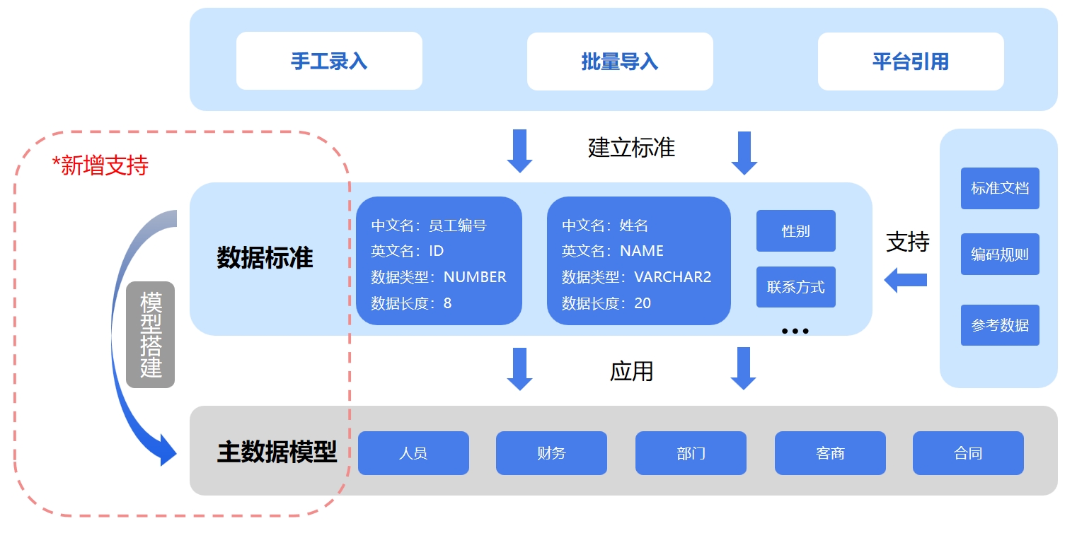 在主数据管理过程中,主数据模型字段需要遵循业务标准,这样可以确保数据在不同系统和流程的一致性,还能实现数据的全程可追溯性,为此产品支持在建立模型字段时根据数据标准建立。