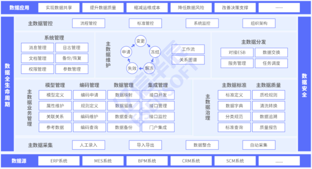 主数据管理流程制定;丰富的可视化报表,完成主数据全生命周期监控。