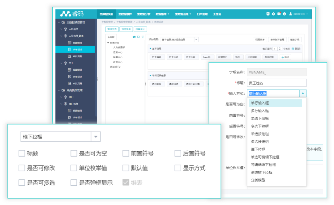 对于主数据的填报维护,平台给予快速专业的表单设计功能,对设置了分类的模型还支持快速批量新建表单、继承表单,并在表单设计中内置多种输入方式及字段属性,可满足各种业务填报需要,同时平台还给予了表单的版本记录功能,保障了数据填报的准确性和一致性。