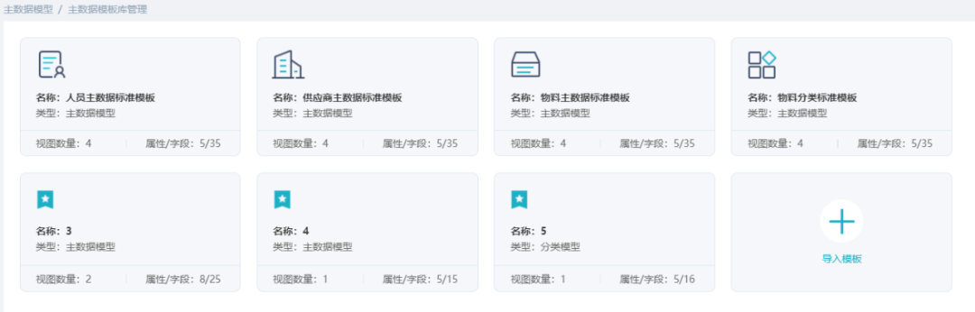 为了提高用户搭建模型的效率,给用户在主数据模型设计时有更多的参考,Ebpay主数据管理平台中内置了多种行业主数据模板,用户可以根据实际需要选择合适模板直接创建模型,或在相似的模板基础上进行修改来完成主数据的建模。
