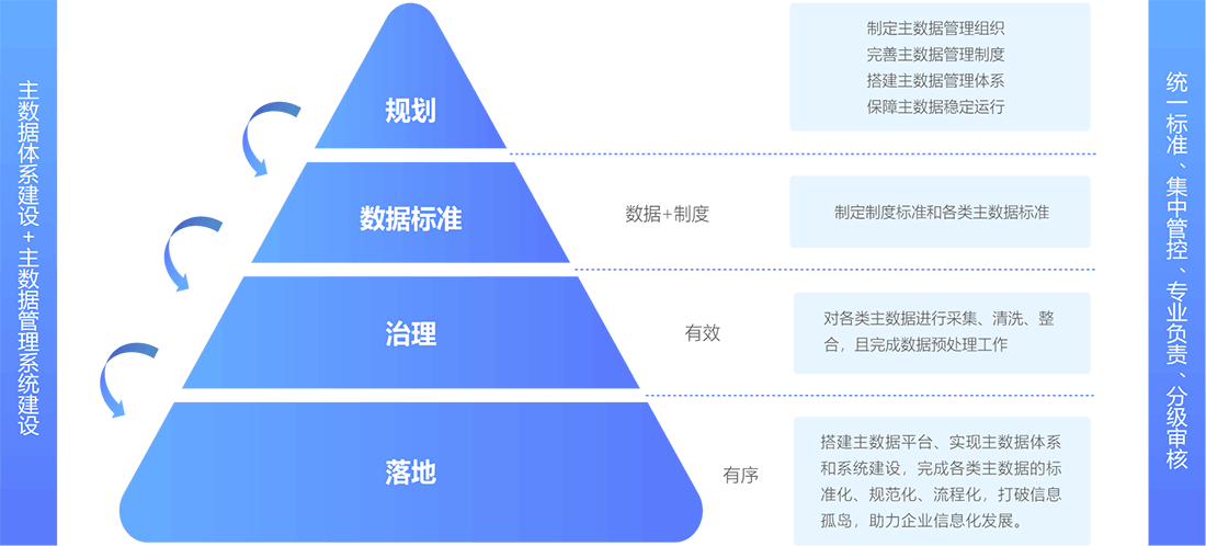 实现对主数据采集、申请、新增、变更、审核、生效、失效、分发等全生命周期管理。支持可自定义的质检方案到整改的全流程主数据质量管控服务,确保主数据的完整性、准确性、一致性、及时性和可获取性。